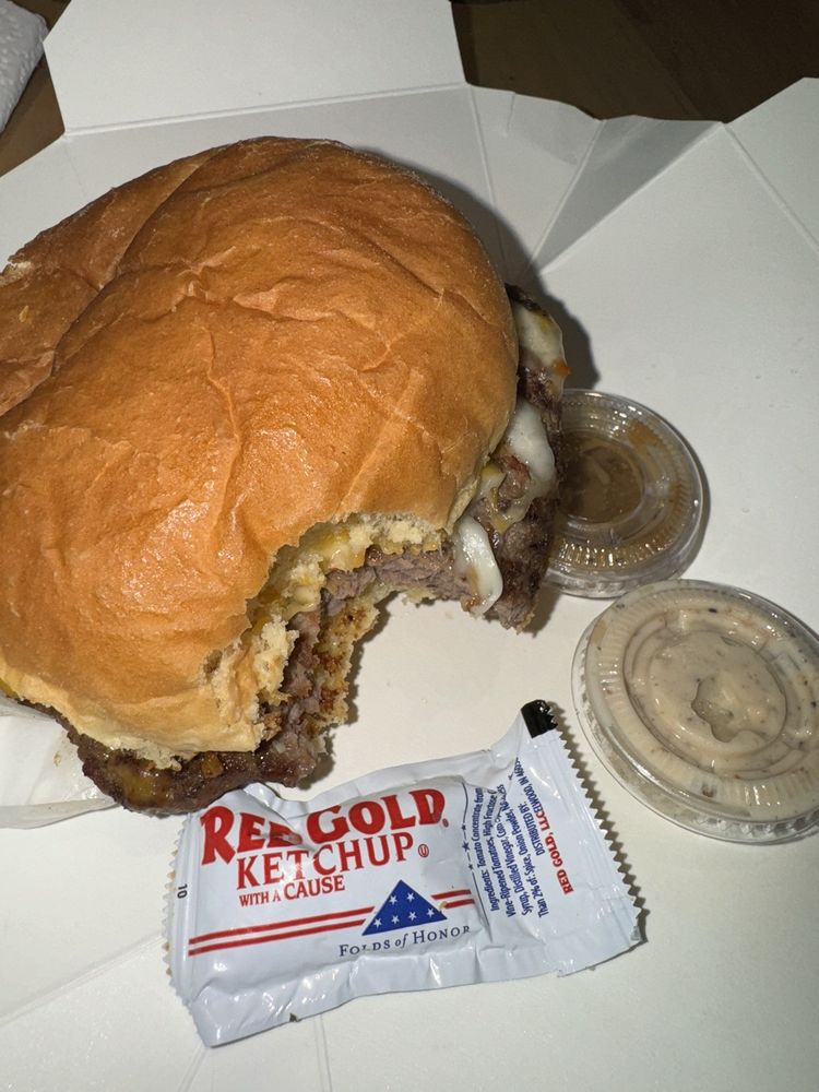 just a well made cheeseburger served meat or plant. only bun/cheese/meat/grilled onion/top & bottom sauce your choice of plant cheese or real cheese!