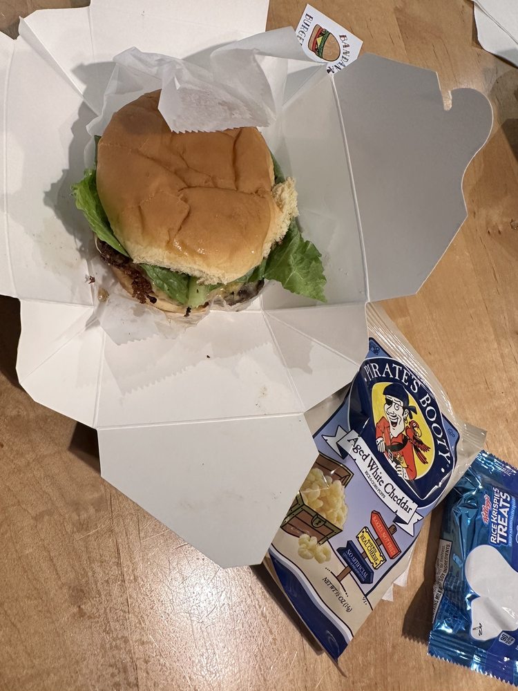 Just a well made cheeseburger served meat. Only bun, cheese, meat, grilled onion, top & bottom sauce your choice of plant cheese or real cheese! Made in house with a little TLC. Comes with a Bag of Popcorn, a Rice Krispie, and a koolaid jammer! Please let us know of any allergies!