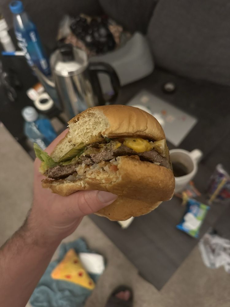 meat burger with bacon + cheese, cooked well & ingrediented with joy, lettuce, love, grilled onion, pickle, tomato and our special top & bottom sauce made in house with a little tlc