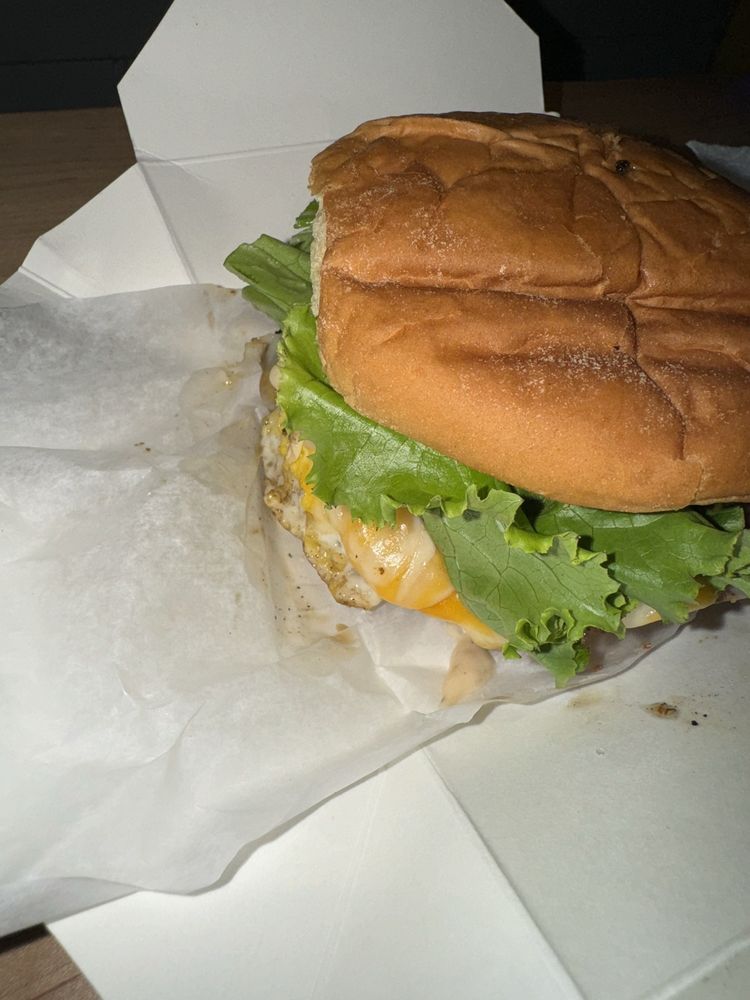 meat burger with cheese + egg + potato, cooked well & ingrediented with joy, lettuce, love, grilled onion, pickle, tomato and our special top & bottom sauce made in house with a little tlc
